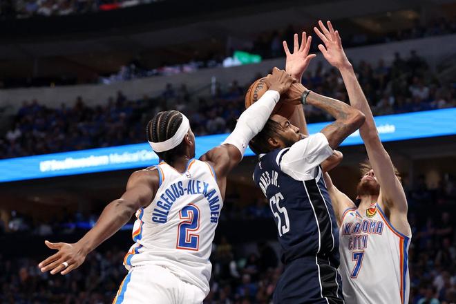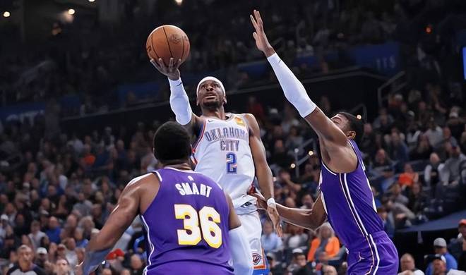 当与目前在西部排名第三的洛杉矶湖人队对决时,雷霆队就取得了一场酣畅淋漓的大胜,几乎完全锁死了对方后场双枪卢卡-东契奇和奥斯汀-里夫斯的发挥。在11月13日的那场比赛中,东契奇全场20投7中,三分线外7投1中,而里夫斯12投4中,三分球5投0中,两人加起来只得到了32分,不仅远低于东契奇和里夫斯赛季的场均得分64.5分,甚至就连东契奇一个人的场均得分都比不上(东契奇本赛季场均35.2分,而里夫斯场均29.3分)。